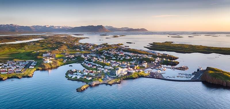 Stykkishólmur is a small, picturesque town known for its colorful houses and scenic harbor. It serves as an important gateway to the nearby Breiðafjörður Bay, and has a strong connection to fishing and maritime culture, reflected in its local museums and active harbor. Stykkishólmur is also home to many historic buildings dating back to the 19th century and is appreciated for its well-preserved architecture and peaceful atmosphere. Surrounded by dramatic landscapes—lava fields, mountains, and ocean views—it offers visitors more quiet and authentic experience of Icelandic life, away from the busiest tourist routes.